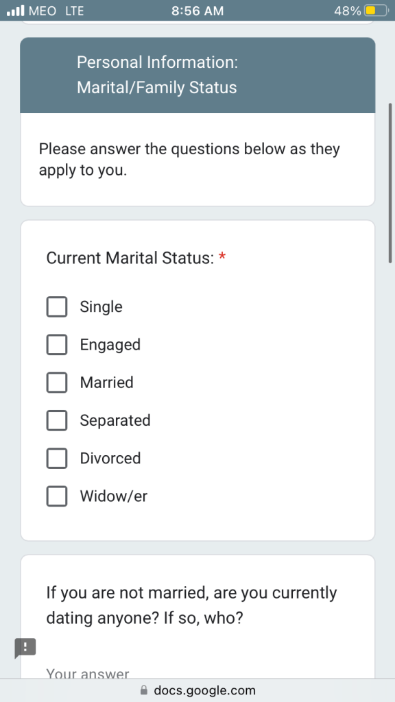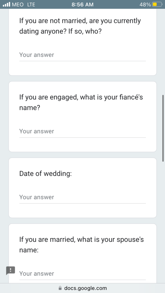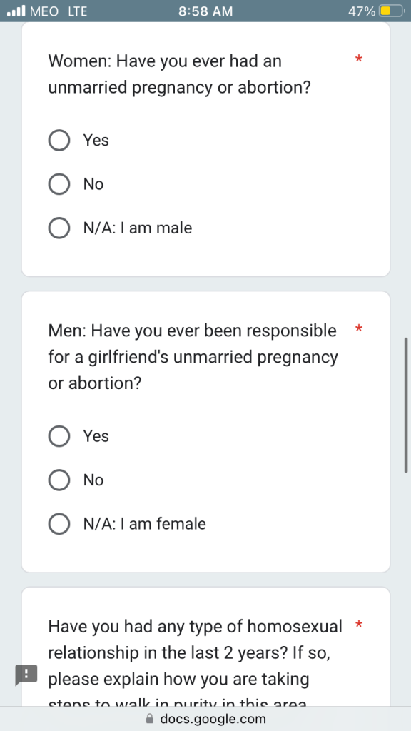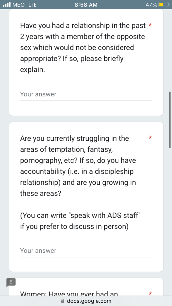 I ask you to look through the questions. What kind of people ask these sorts of questions? Why do they want this information, especially on people’s sexual history? It is very creepy for these questions to be asked of college guys and girls, especially the girls…