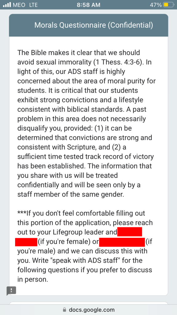 Things were progressing as usual; the community was fun and the sermons were good, but Discipleship was weird. It was weird that I had to meet with a spiritual superior on a weekly basis. The question started to cross my mind, “Am I sinning by not disclosing things in Discipleship?”